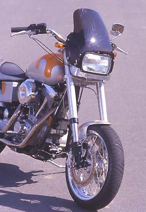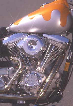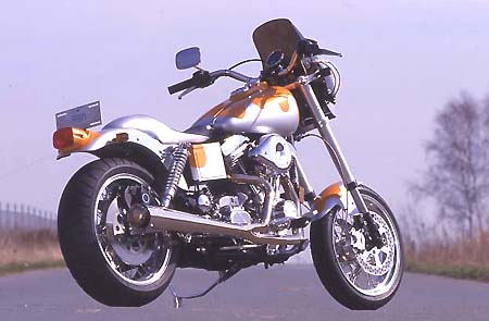 Damit die werte Kundschaft auch erfährt, was in dem S&S-Hammer steckt, entschloss man sich bei W&F einen super Wetzhobel auf die Gummiwalzen zu stellen. Denn bekanntlich wird man vom "Essenzugucken" nicht satt, und wer für rund 7000 Euro solch eine Druckmaschine ins Fahrwerk hieven möchte, will schließlich vorher wissen, wie damit die Post abgeht. Und deswegen hier gleich vorweg, die gezeigte Maschine steht für alle ernsthaften Kaufinteressenten zur Probefahrt bereit. Ein Anruf bei W&F genügt. Doch bis es so weit war, mussten die Spezis in Garbsen zunächst mächtig die Schraubenschlüssel schwingen. Als Basis diente eine Harley-Davidson FXD Dyna Glide von 1997. Von der, Willie G. Davidson möge den Boys verzeihen, lediglich Rahmen, Schwinge, Tank, Fünfganggetriebe, Fußrasten sowie einige Kleinigkeiten übrig blieben. Anstelle der originalen Kraftquelle steckte Thomas Warneke besagten S&S Knaller ins Chassis. Für pünktlichen Zündfunken in jedem Zylinder sorgt eine elektronische Crane-High-4 Anlage, bei der sich die Zündkurve individuell verstellen lässt. Gleich drei Aufgaben erfüllt die Zodiac "Supertrapp" 2-in-1-Auspuffanlage: tolle Optik, klasse Sound und optimale Leistungsausbeute. |