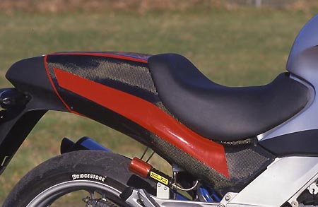 Mit dem Know How von Bernd Scherers Bekannten entstand in Kassel die selbsttragende Heck-Sitzbank-Kombination aus Kohlefaser. In dem nur knapp 2,5 kg schweren Einpersonen-Heckteil ist ein 12 Liter Staufach, das Platz für die Batterie sowie Halterungen für Kühl- und Bremsflüssigkeitsbehälter bietet, untergebracht, das Unterteil fungiert gleichzeitig als Radabdeckung. |