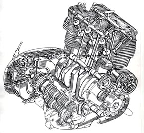 Motorblock war vertikal geteilt, zwei untenliegende Nockenwellen