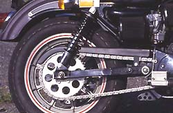 Kraftübertragung Primärantrieb über Triplex-Kette, Mehrscheibenkupplung im Ölbad, klauengeschaltetes Vierganggetriebe, Sekundärantrieb über Kette |