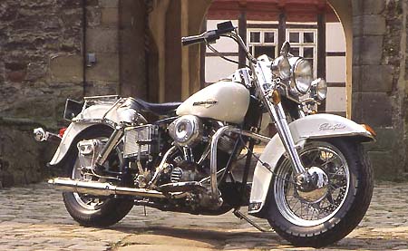 Der Betrachter glaubt sich hundertprozentig sicher und bekundet seine Anerkennung für die gelungene Restauration. Wie neu parkt die Harley lässig auf dem Seitenständer, der Lack glänzt, der Chrom spiegelt. Die Maschine steht auf dicken 16-Zoll-Reifen, die von breiten Stahl-Kotflügeln abgedeckt werden. Jedes Detail lässt sich angucken. Sei es die verchromte Lampe, der breite Lenker, die Windschutzscheibe, der große Tacho auf dem Benzintank, die Trittbretter für den Fahrer und Beifahrer, das Heck mit den Koffern und natürlich der gewaltige V-Motor. Störend wirken bei dem Klassiker lediglich die Guss-Felgen und Scheibenbremsen. Zweifel werden wach. Sollte es sich bei der Electra Glide Road King gar nicht um einen aufgemöbelten Oldtimer handeln? Harley-Davidson ist der Streich prächtig gelungen. Das Bike stammt nämlich aus dem aktuellen Modellprogramm von 1995, es wurde absichtlich im Stil der 60er Jahre designed. Die Harley-Manager kennen die Wünsche ihrer Kundschaft ganz genau, sie haben diese "moderne" Maschine mit klassischen Elementen ausgestattet. |