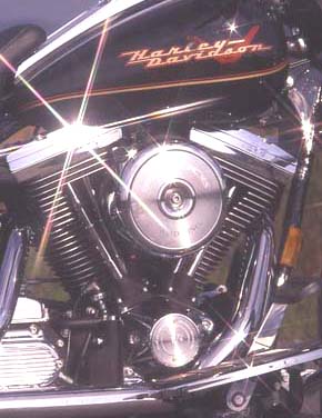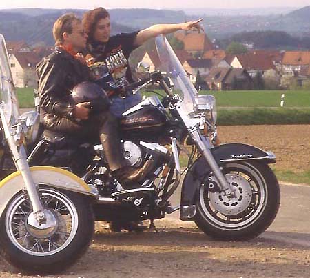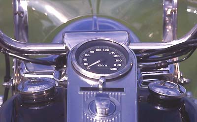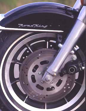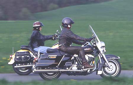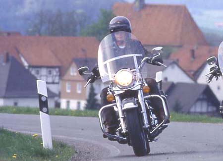 Ganz im Gegenteil. Wie auf der Brücke eines Ozeandampfers thront man auf dem Bike, hat den gebogenen Lenker lässig in den Händen und harrt der Dinge, die da kommen. Man schwebt regelrecht über die Fahrbahn. Die Füße stehen auf den Trittbrettern, zum Gangwechsel genügt ein leichter Tritt auf die Schaltwippe, zum Bremsen des Hinterrades wird der rechte Fuß auf das Bremspedal gestellt. Diese Arbeit erfordert Zeit, Stress kommt nicht auf. Ist der fünfte Gang eingelegt, braucht man sich keine Gedanken mehr zu machen. Ab 50 km/h zieht der dicke 60 PS Motor selbst im großen Gang die Chose vorwärts. Unter einem rumort zwar irgendwo der 1338 ccm V-Motor, doch den eigentlichen Pulsschlag, sowie nervige Vibrationen, spürt man kaum - das Triebwerk ist nämlich in Gummielementen gelagert. Die Fahrwerksabstimmung lässt keine Wünsche offen. Satt liegt die Road King auf der Straße. Ganz gleich, ob bei "Stop and Go" im Stadtverkehr, auf verwinkelten Landstraßen oder kilometerlangen Autobahnetappen: Der Weg ist das Ziel. |