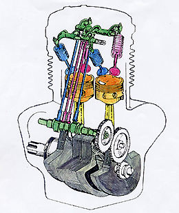 untenliegende Nockenwelle; Stößel; Stoßstangen; Kipphebel; zwei