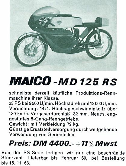 Alle Mühen sollten sich lohnen, Manfred Bernsee wurde 1968 Jupo-Meister, Toni Gruber konnte die internationalen Rennen in Gröding bei Salzburg und Nova Gorica in Jugoslawien gewinnen. Entgegen aller bisherigen Vorbehalte aus der Chefetage beschloss man nun aber doch eine Kleinserie käuflicher 125er Maico-Rennmaschinen auf den Markt zu bringen. Die Vorstellung für den Productions-Racer stand auch bald fest: die IFMA im Herbst 1968 in Köln. |