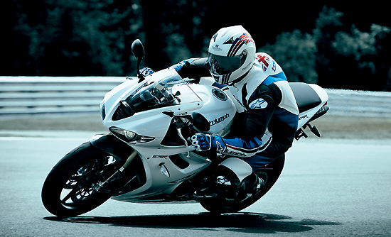 Mit der 2011 komplett neuen Daytona 675R präsentiert Triumph das ultimative Motorrad für herzhafte Landstraßenjagden und ambitionierte Rennstreckentrainings. Auf Basis der für sich schon großartigen Daytona 675 kreierten die Triumph-Entwickler in Zusammenarbeit mit den schwedischen Fahrwerksspezialisten von Öhlins ein Motorrad, nach dem sich die anspruchsvollsten Rennstreckenfahrer die Finger lecken. Öhlins steuert die revolutionäre 43 mm NIX30-Gabel bei, die sich üblicherweise nur bei Rennmotorrädern oder exklusiven italienischen Motorrädern findet, sowie das aus der MotoGP stammende TTX36 Zentralfederbein. Die radial montierten Monobloc-Vierkolbenfestsättel und der Radial-Haubtbremszylinder stammen vom italienischen Spezialisten Brembo und sichern der Daytona 675R allergrößte Verzögerungskunst. Weitere serienmäßige Rennstreckenfeatures an der Daytona 675R sind ein Schaltautomat und zahlreiche Kohlefaserteile wie die Hinterradabdeckung, das Auspuff-Hitzeschild und der vordere Kotflügel. Die Daytona 675R verfügt ebenso über das umfangreiche Instrumentarium der Standard-Daytona 675 mit Laptimer und programmierbarem Schaltblitz. Motorseitig vertraut die neue Daytona 675R dem ausgezeichneten 675-cm3-Dreizylinder der Daytona 675 mit 125 PS Maximalleistung bei 12.600 U/min. Dazu serviert der Triple das klassenbeste Drehmoment von 72 Nm, womit schnelles Fahren auf Anhieb leicht gemacht wird. Rein optisch steht die Daytona 675R allein durch die goldenen Öhlins-Federelemente im Mittelpunkt. Sportliche neue Graphics umfassen ein neues Triumph-Tanklogo, und die besondere Farbgebung unterstreicht den Premiumcharakter der Daytona 675R. Die Verkleidung in funkelndem Crystal White harmoniert sauber mit der rennmäßig schwarzen Bugverkleidung und dem markanten roten Hilfsrahmen. Das Triumph Original-Zubehörprogramm halt eine Vielzahl speziell für die Daytona 675R konstruierter Produkte bereit wie die Arrow Slip-on-Schalldämpfer, CNC-gefräste Hebeleien und eine Einzelsitzabdeckung. Neues 2011er Modell Serienmäßige Öhlins-Federelemente Einzigartige Daytona 675R-Graphics und Outfit Serienmäßiger Schaltautomat und Brembo-Bremsen Dreizylinder-Reihenmotor der vielfach ausgezeichneten Daytona 675 mit 125 PS und 72 Nm |