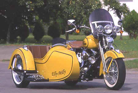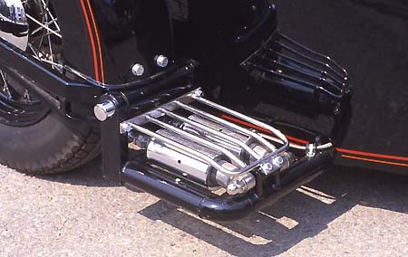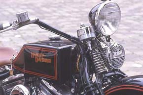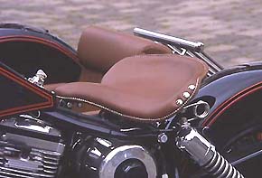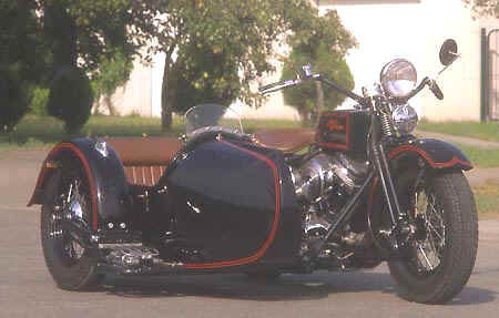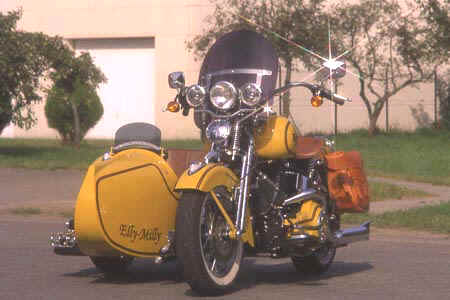 Mit dem einfachen Anbau an eine x-beliebige Harley wollten wir uns für unser Vorführgespann jedoch nicht zufrieden geben. Auch das Bike muss zum klassischen Outfit passen", betont Manni. Als Basis diente eine 86er Evo Wide Glide, die mit Springer-Gabel, 16-Zoll-Reifen und breiten Kotflügeln den Vorstellungen schon sehr nahe kam. Doch dabei sollte es aber nicht bleiben. Schwingsattel, Trittbretter, Fußkupplung und Handschaltung gehören ebenso in die Zeitreise von Anno dazumal wie der von "V-Triebwerk" selbst gefertigte Benzintank aus Stahlblech. Kein Abstrich wurde dagegen bei der Sicherheit gemacht, ringsum übernehmen Scheibenbremsen die Verzögerungsarbeit. |