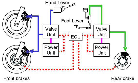 1. Elektronische Steuerung des CBS für eine bessere Steuerung der Bremskraft. Das sorgt für eine sensiblere Verteilung der Bremskraft auf beide Räder. 2. Messung der vom Fahrer ausgeübten Kraft an jedem Bremshebel. Die ideale Bremskraft an beiden Rädern wird entsprechend erzeugt und optimal verteilt, wodurch Einflüsse auf das Fahrverhalten der Maschine minimiert werden. 3. Ein „ABS Modulator” sorgt dafür, dass das ABS spät ausgelöst wird und geschmeidig eingreift. 4. Aufgrund ihrer geringen Größe lassen sich die
