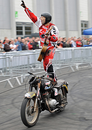 Andrang auch auf der Bühne von „VivaLaMopped“, einer Initiative des IVM. Über 2.500 Teens zwischen 16 und 20 Jahren bewarben sich vor Ort, um einen der fünf kostenlosen Motorradführerscheine zu gewinnen und natürlich auch um ihre Lieblingskünstler zu treffen. Auf der VivaLaMopped-Bühne performten Sistanova, die Donots, Max Buskohl & Empty Trash, Die Happy, Oomph, Blumentopf oder Vanessa Petruo, gaben Autogramme und ließen im Interview mit Markus „Commander“ Schultze keine Fragen unbeantwortet. Prominente Motorradfans aus Musik, Schauspiel und Motorsport trafen sich zur Auftaktveranstaltung der INTERMOT Köln 2008. Am Start waren Tatort-Kommissar Richy Müller, „Fanta 4“-Star Smudo, die Musikerin und „Ex-NoAngel“ Vanessa Petruo, die deutsche Hoffnung in der Superbike-WM Max Neukirchner sowie der vielfache Stuntweltmeister Chris Pfeiffer. Im Gespräch mit Markus Schultze drehte sich dabei natürlich alles um motorisierte Zweiräder. Erstmalig wurden im Rahmen der INTERMOT Köln 2008 die Cologne Custom Championships initiiert, wo sich die besten Bikes der Kategorien Chopper/Cruiser, Fighter, Sportler und Scooter auf fast 1.000 m² präsentierten. Der Gewinner Christoph Madaus mit seiner Twin Trax freute sich neben dem Siegercheque in Höhe von € 5.000 besonders über die direkte Qualifikation für die Customizing Weltmeisterschaft in Sturgis/USA inklusive Transportkosten. Schon traditionell fand zur INTERMOT Köln in Kooperation mit dem Team des Mogo Hamburg um Pastor Erich Faehling der ökumenische „Motorrad-Gottesdienst“ im Kölner Dom statt. Rd. 4.000 Biker (2006: 3.000) beteiligten sich am Gottesdienst und dem anschließenden Corso quer durch Köln in Richtung Messe. Ein weiteres Highlight war erneut die „Suzuki Night of the Jumps“, die Weltmeisterschaft der Freestyle Motocrosser in der LANXESS arena. |
