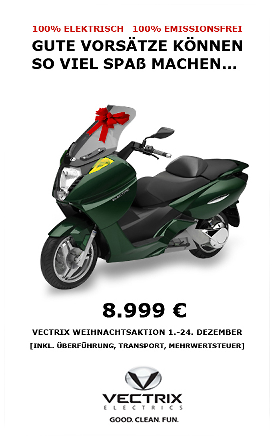 Vom 1. bis zum 24. Dezember 2008 haben wir ein besonderes Vectrix VX-1 statt für 9.999 € für 8.999 € inkl. MwSt., Überführung und Transport an Ihre Wunschadresse innerhalb Deutschlands!
