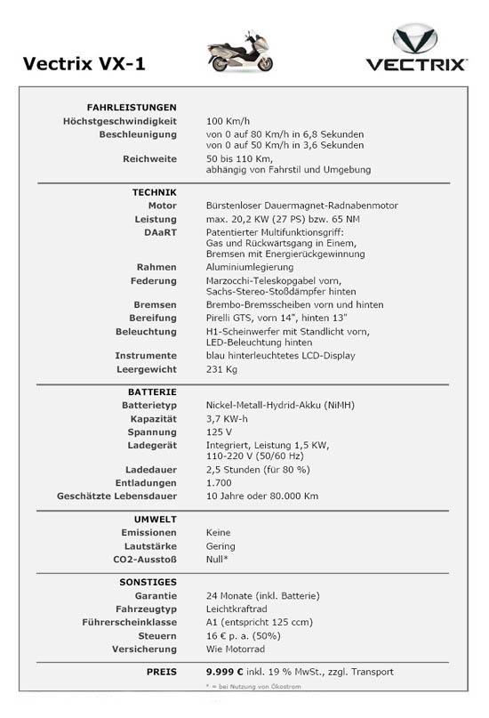 Die Vectrix Deutschland GmbH ist als Generalimporteur für die Premium-Zweiräder der amerikanischen Marke Vectrix seit Frühjahr 2008 im Direktvertrieb tätig. Von Berlin aus trägt das Jungunternehmen dazu bei, innovative Elektro-Zweiräder zur nachhaltigen Mobilität mit dem Leitgedanken „Good. Clean. Fun.“ schon heute auf unsere Straßen zu bringen. Bereits 1996 wurde die Vectrix Corp. in den USA zunächst mit dem Ziel der Entwicklung einer kommerziellen Technologieplattform für Null-Emissions-Fahrzeuge gegründet. Später entschied man sich zur Produktion des weltweit ersten Großrollers mit Elektroantrieb. In Zusammenarbeit mit international bekannten Technologiepartnern und Zulieferern, sowie diversen Patenten, hat sich Vectrix heute als Marke etabliert und einen Führungsanspruch in der Elektromobilität gesichert.