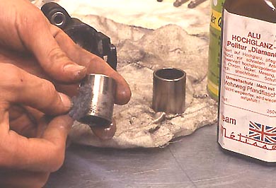 feiner Stahlwolle wird die Kruste von den Bremskolben wegpoliert |