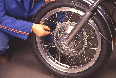 gegen eine Speiche; klingt der Ton hoch, ist sie fest, macht es nur