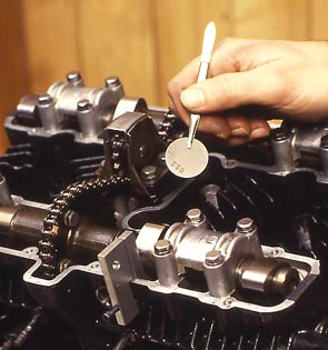 Bei Motoren mit obenliegenden Nockenwellen und direkter Ventilbetätigung wird das Spiel zwischen Nocken und Tassenstößel gemessen. Deutlich muss der höchste Nockenpunkt um 180 Grad zur Stößelfläche zeigen. In dieser Position ist gewährleistet, dass das Ventil geschlossen ist. Das Prüfen des Spiels erfolgt genau wie oben schon beschrieben, nur wenn man es einstellen muss, lässt es sich nicht so einfach korrigieren. |